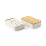 1.4l lunch box in resistant BPA-free veined PP material, with bamboo lid. Two compartments, each with a capacity of 700 ml. Inner compartment with fork, spoon and knife. Including outer safety strap. Food Grade certified, guaranteeing safety when food comes into contact with the material used to manufacture the product.